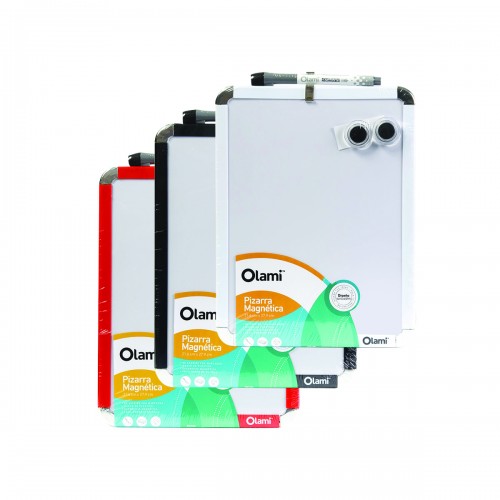 PIZARRA BLANCA MAGNETICA MARCO DE COLOR 22 X 30 CM. C/ MARCADOR BORRABLE E IMANES OLAMI